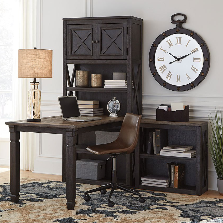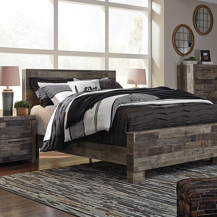 Complete your dream space with this rustic gray planked replicated oak grain to give the room an authentic touch. Sticks across the headboard give a thick planked look, and side roller glides make for smooth operating drawers.