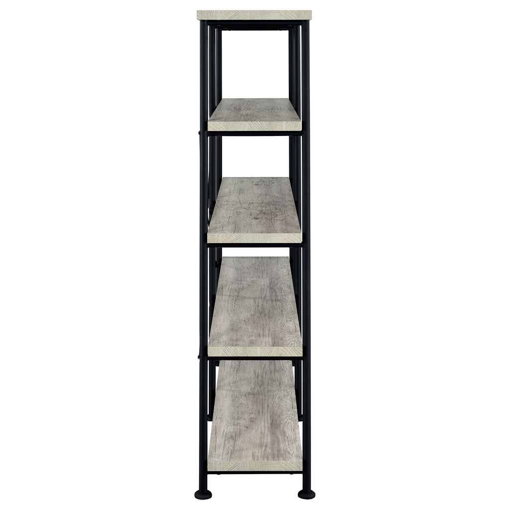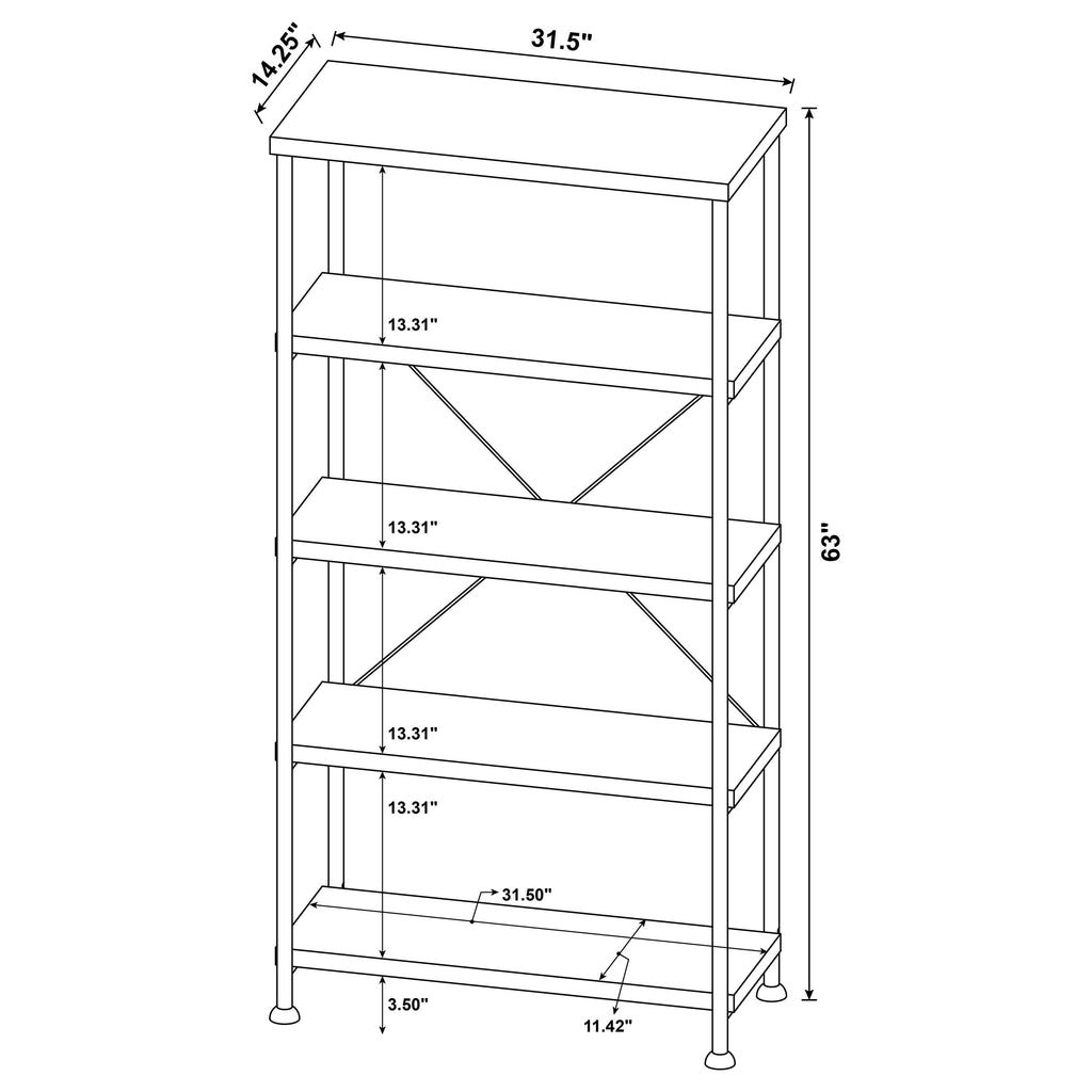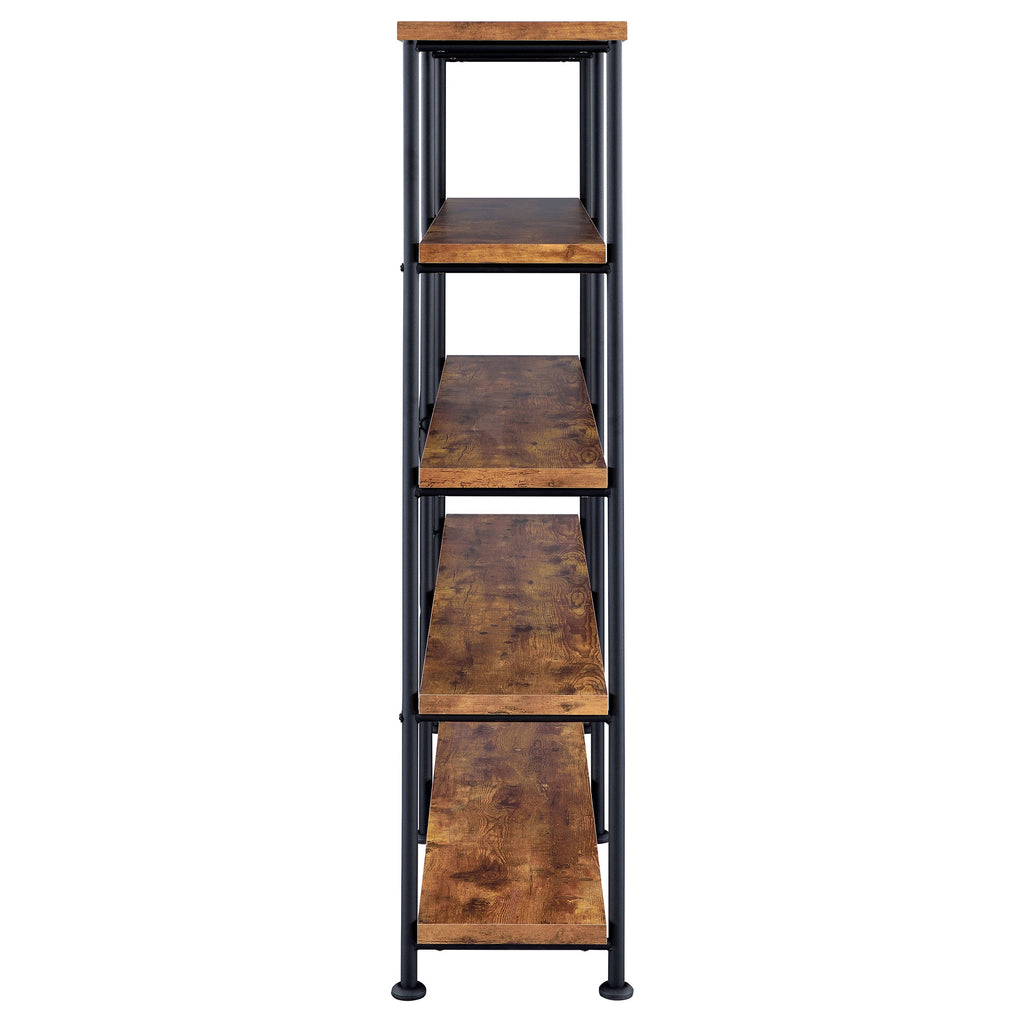 Embrace a traditional look with contemporary upgrades. Choose this bookcase to organize accents and books in a transitional space. Minimalist styling reflects a classic dynamic reflecting a hint of industrial aesthetics. Find plenty of room on four side shelves to display books and decor. Select from finishes that suit your space. Key Features: • Double bookcase with four extra-wide tiers for ample display and storage space • Rustic nutmeg finish offers a warm wood tone with industrial character • Black powder-coated steel frame enhances contrast and structural stability • Crossbar detailing on the back reinforces support without adding bulk • Open shelf design keeps contents visible and accessible from all sides • Made from engineered wood, melamine paper, and heavy gauge metal