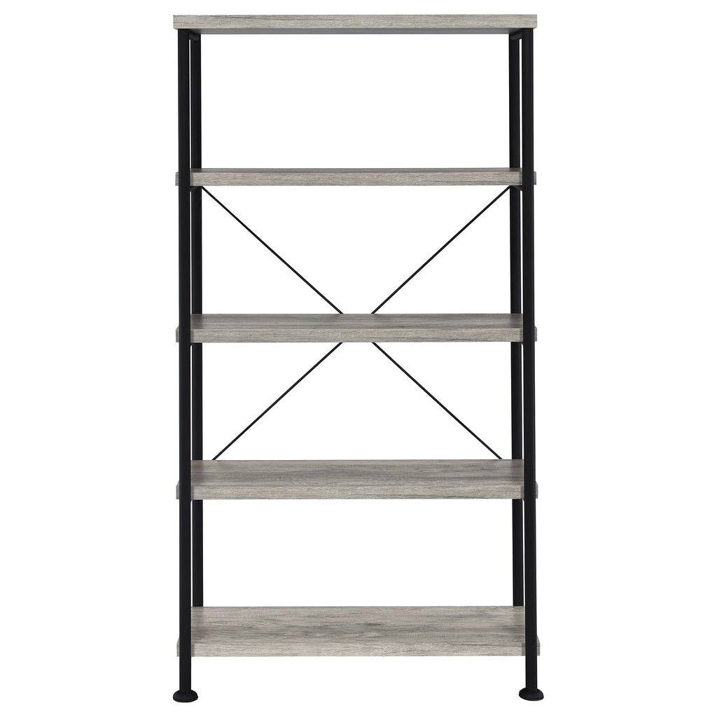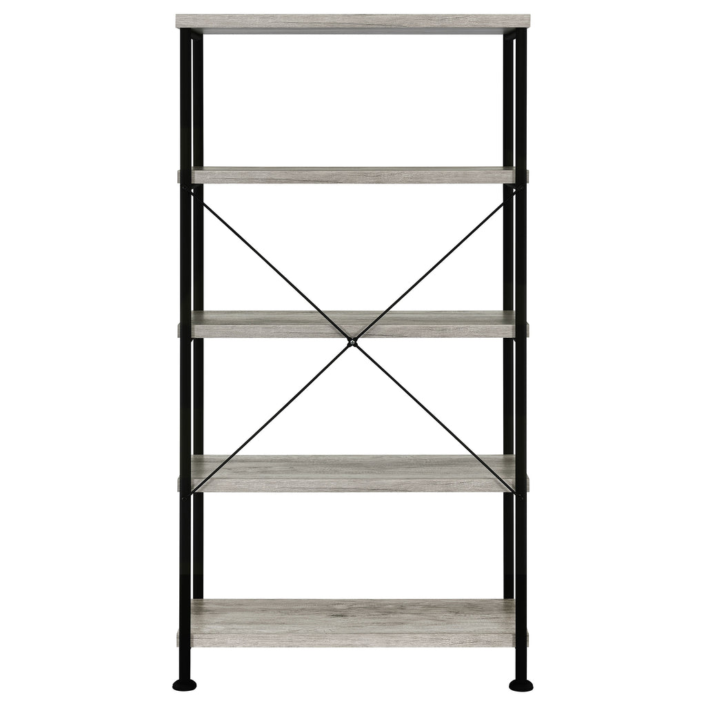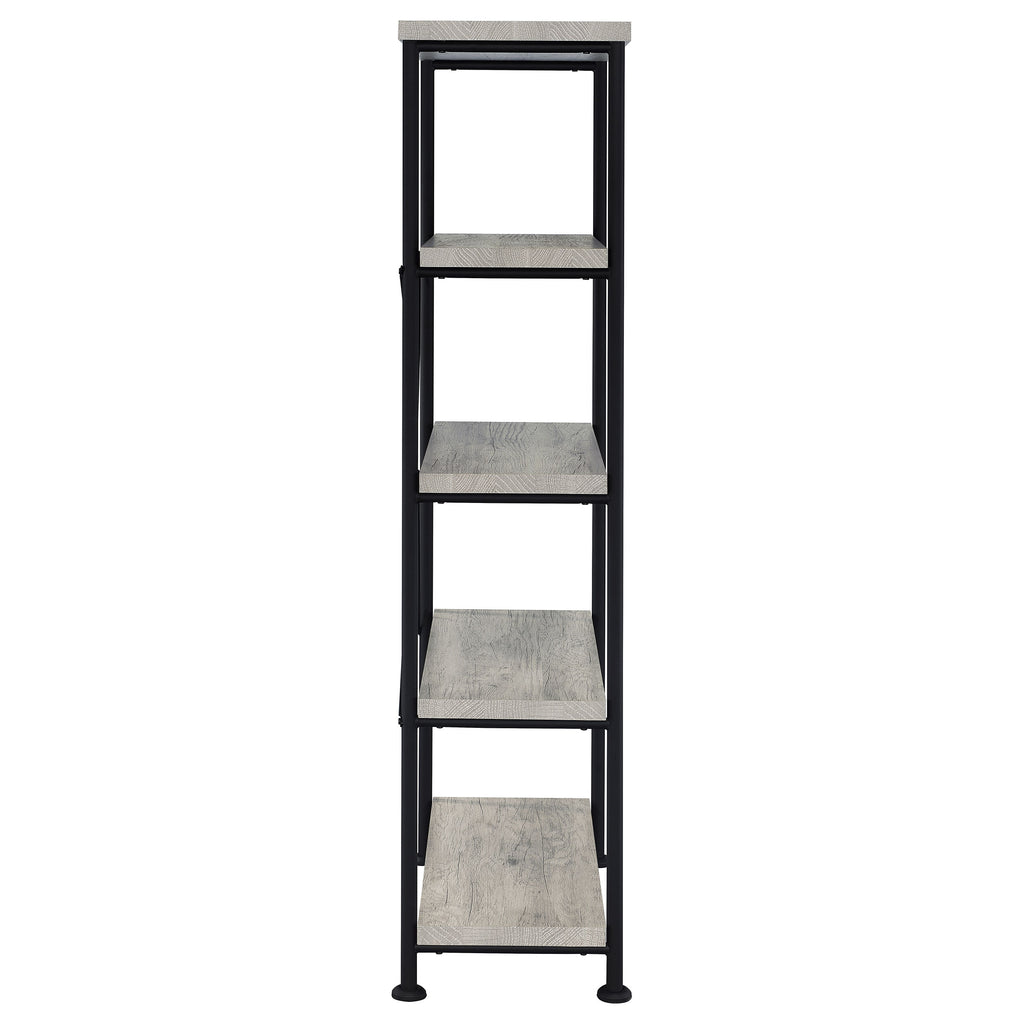 Embrace a traditional look with contemporary upgrades. Choose this bookcase to organize accents and books in a transitional space. Minimalist styling reflects a classic dynamic reflecting a hint of industrial aesthetics. Find plenty of room on four side shelves to display books and decor. Select from finishes that suit your space. Key Features: • Double bookcase with four extra-wide tiers for ample display and storage space • Rustic nutmeg finish offers a warm wood tone with industrial character • Black powder-coated steel frame enhances contrast and structural stability • Crossbar detailing on the back reinforces support without adding bulk • Open shelf design keeps contents visible and accessible from all sides • Made from engineered wood, melamine paper, and heavy gauge metal
