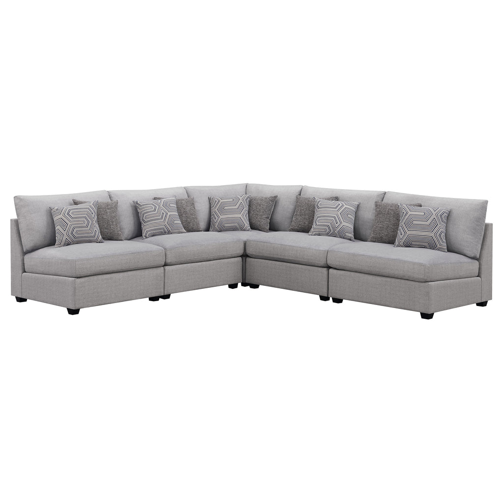 This modular sectional sofa embodies contemporary comfort with clean lines, inviting textures, and customizable flexibility. Upholstered in soft grey fabric, it features supportive cushions wrapped in plush feather-down for an indulgent seating experience. Subtle wedge details and tapered block feet lend modern refinement, while the modular design allows each piece to adapt effortlessly to any space. Perfect for family gatherings or relaxed lounging, it delivers style, durability, and lasting comfort in one cohesive design._x005F_x000D_ Key Features: • Modular sectional sofa with soft grey upholstery offers modern style and plush comfort • Configurable design allows flexible seating layouts for any living room arrangement • Hidden storage ottoman adds versatility for blankets, pillows, or everyday essentials • Plush feather-down wrapped cushions deliver inviting comfort and long-lasting support • Tapered block feet and subtle wedge details enhance its contemporary refined profile • Perfect for relaxing, entertaining, or family gatherings in a cozy modern setting