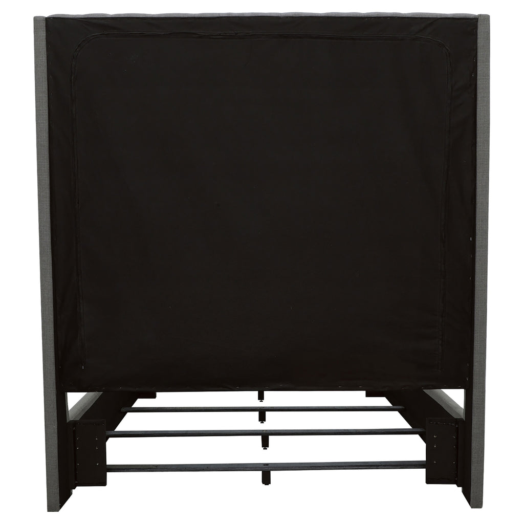 This impressively-styled bed makes a bold yet fashionable statement. It features an imposing, 72" high headboard that's bold. Yet, the headboard comes with button tufted fabric that's stylish and eye-catching. The bed sits on solid wood legs finished in lush cappuccino for a touch of charm. This bed is a graceful addition to the bedroom. Key Features: • Upholstered bed in grey or cream fabric • Extra-tall 72"H button tufted headboard • Available in grey and cream fabric • Solid birch legs in cappuccino finish • Also available as headboard only • Pine and plywood frame • Requires box spring