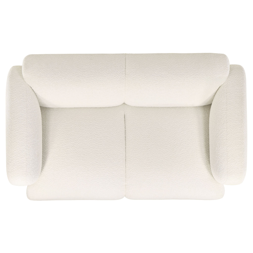 This sculpted loveseat brings bold softness and inviting texture to modern spaces. Its low-profile frame is wrapped in richly textured fabric with a cozy, tactile feel. Rounded track arms and a smooth, contoured silhouette create a cocoon of comfort. High-quality foam and pocket coil seating ensure long-lasting support without sacrificing softness. With a clean, minimal form, this two-seat loveseat adds warmth and refined presence to any living room or lounge. Key Features: • Two-seat loveseat with low-profile, sculptural silhouette and soft, rounded edges • Textured white fabric upholstery offers warm tone and inviting hand feel • Curved track arms and contoured frame provide supportive modern style • High-quality foam padding adds plush comfort to every seating zone • Pocket coil seating delivers durable support and shape retention • Perfect for compact living spaces seeking soft form and relaxed design
