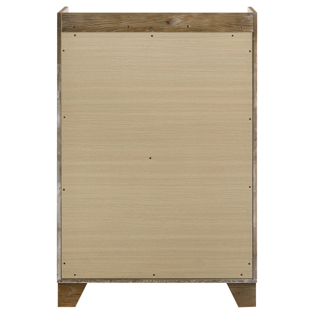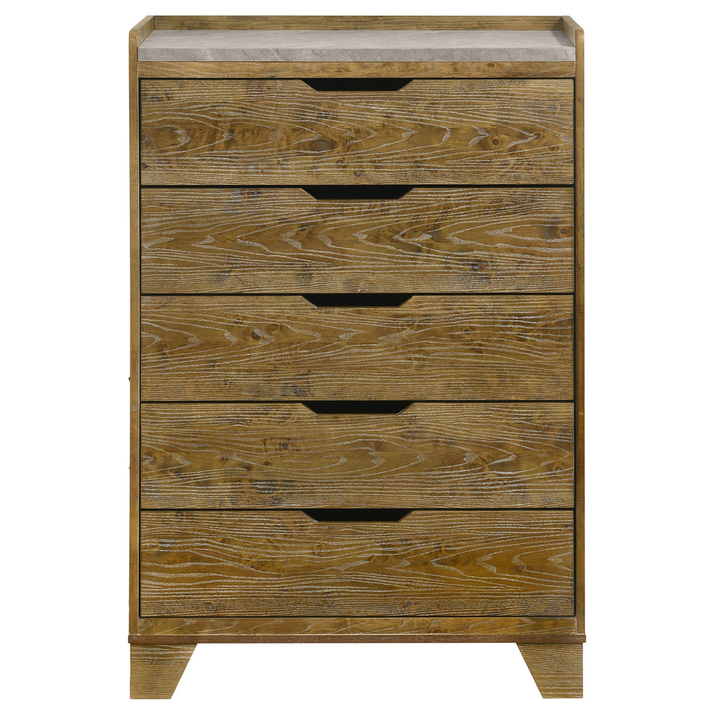 Rustic charm meets modern refinement in this five-drawer chest of drawers, where natural textures and contemporary lines come together in perfect balance. The embossed oak grain surface is finished in a warm medium oak tone that highlights the richness of the solid rubberwood construction. A faux marble melamine top adds a touch of elegance, while the sculpted finger pulls and heavy-duty glides ensure smooth, quiet function with every use. Key Features: • Five-drawer chest of drawers merges rustic warmth with clean contemporary structure • Solid rubberwood frame with embossed oak grain in a weathered medium oak finish • Melamine faux marble top adds soft contrast with white and grey veining detail • Sculpted finger pulls offer a minimalist touch and easy, streamlined access • Metal extension drawer glides ensure smooth operation and reliable performance • Includes tip-over restraint for added safety and long-term peace of mind