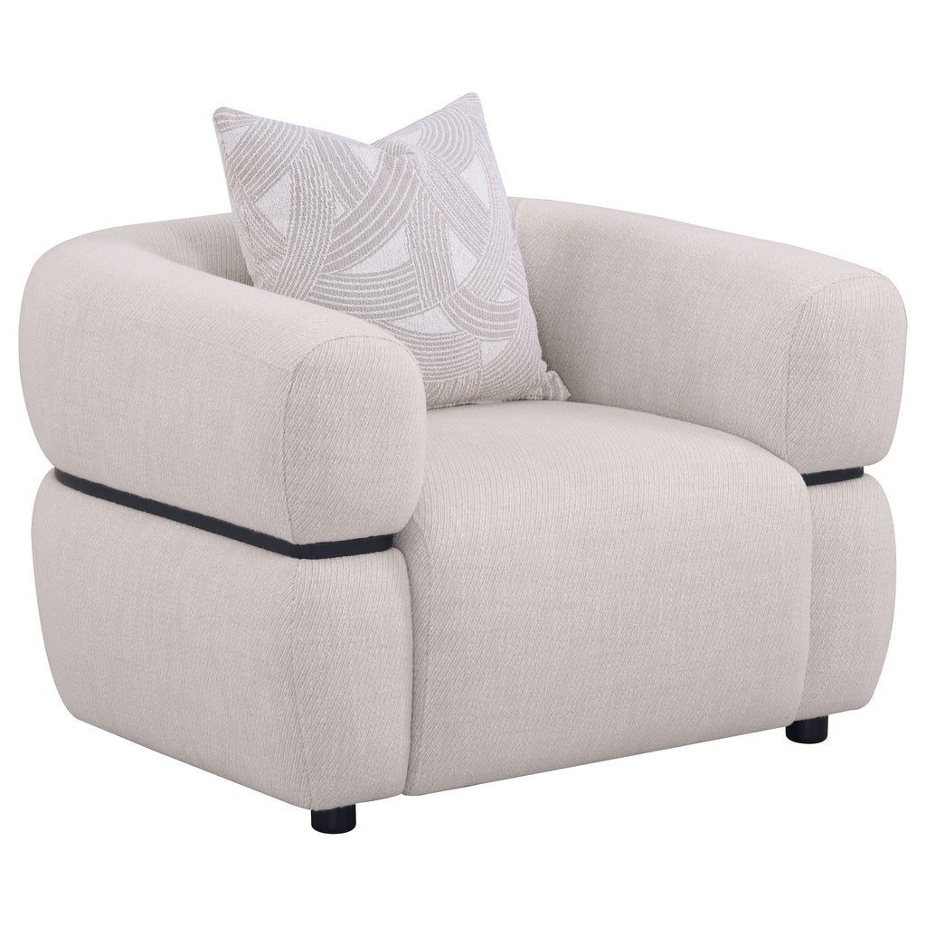 Sculptural in form yet grounded in comfort, this accent chair commands attention with its bold silhouette and plush detailing. Its wide, arched arms and thick waterfall seat are upholstered in textured fabric for a modern, tailored appeal. A distinctive solid wood waistband encircles the frame, while a down and pillow accents adds softness. With pocket coil support and refined shaping, it brings confident elegance to any living space. Key Features: • Generously scaled accent chair in beige finish with wide curved arms and sculptural silhouette • Textured fabric upholstery delivers plush softness and a modern tailored appearance • Thick waterfall bench seat features pocket coil construction for lasting support and comfort • Includes one loose accent pillow in a decorative down and feather blend for added luxury • Solid wood waistband detail elegantly wraps the exterior with sculptural refinement • Small dark brown bun feet subtly complement the profile and wood detailing above