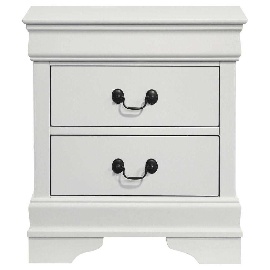 Honor classic simplicity with this two-drawer nightstand. Slightly tapered legs add dimension that balances the tapering of the top of the silhouette. A rich cappuccino finish creates a warm and welcoming effect. Constructed of wood veneer and select hardwoods, this nightstand looks great topped with candles or flowers. Bright metallic hardware creates a contrast against the deep, traditional hues and silhouette. Key Features: • Two-drawer nightstand with classic, simple design • Features slightly tapered legs and top for a balanced silhouette • Rich cappuccino finish adds warmth and a welcoming feel • Constructed from wood veneer and select hardwoods for durability • Bright metallic hardware contrasts beautifully with the deep, traditional hues