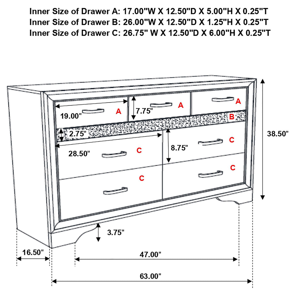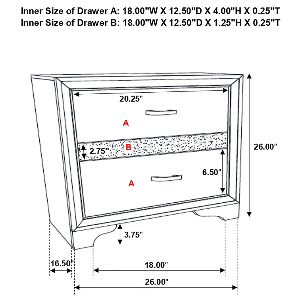 Encourage a glam vibe in your refined bedroom with a modern four-piece bedroom set. Centering on a stylish bed with an upholstered headboard and low footboard, the set includes a two-drawer nightstand for easy bedside storage and display space. A seven drawer dresser and mirror complete the set, adding diamond-like trim across its face that catches the light and offers a sophisticated touch. Bracket feet add a touch of dimensionality and movement to each piece and jewel-like bar pulls add intriguing sparkle. A cool white finish is textured, while white finish trim is smooth, creating a touch of textural contrast that add engaging style. Key Features: • Bedroom set with upholstered panel bed featuring glitter-accented headboard stripe • Textured white panel surfaces contrasted by smooth white molded trim throughout • Low profile footboard and bracket legs offer a modern and airy foundation • Storage cases include secret jewelry drawers behind glittery front panels • Drawers are felt-lined and glide on full-extension hardware for smooth operation • Crystal-style handles and sparkling trim provide glam-inspired sophistication