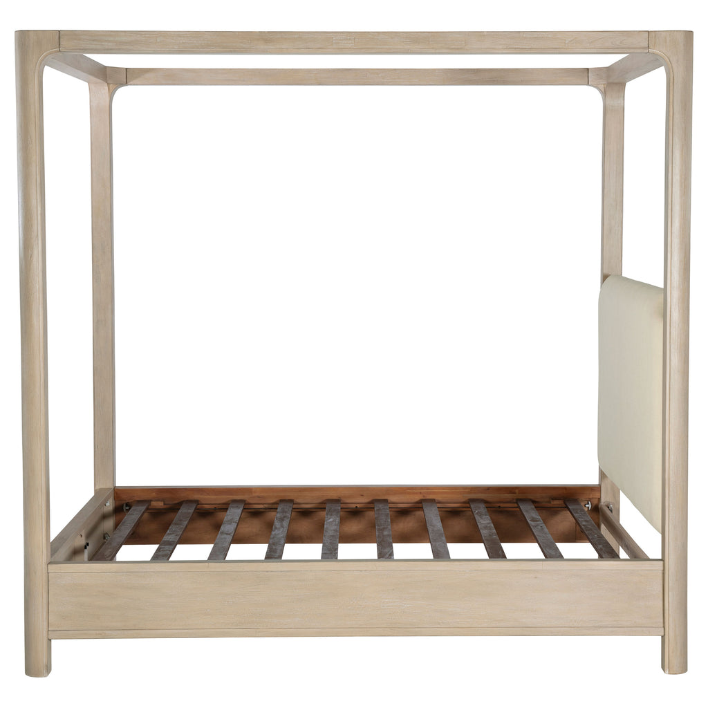 Airy and architectural, this canopy bed brings sculptural presence and soft romance to the bedroom. Gracefully arched posts frame a tall silhouette, while an upholstered headboard adds a tailored layer of texture and comfort. Designed with a platform panel base, it offers lasting support without the need for a foundation. Crafted from mahogany, engineered wood, mango veneer, and fabric, this piece blends strength and serenity in perfect harmony. Key Features: • Queen canopy bed with arched frame and soft upholstery for graceful architectural impact • Weathered mango finish brings organic warmth and visible wood grain to the frame • Beige upholstered headboard adds texture, comfort, and tailored visual balance • Slat kit with platform panels supports mattress without requiring a foundation • Crafted from mahogany, engineered wood, mango veneer, and soft polyester fabric • Perfect for creating a statement centerpiece with peaceful proportion and structure