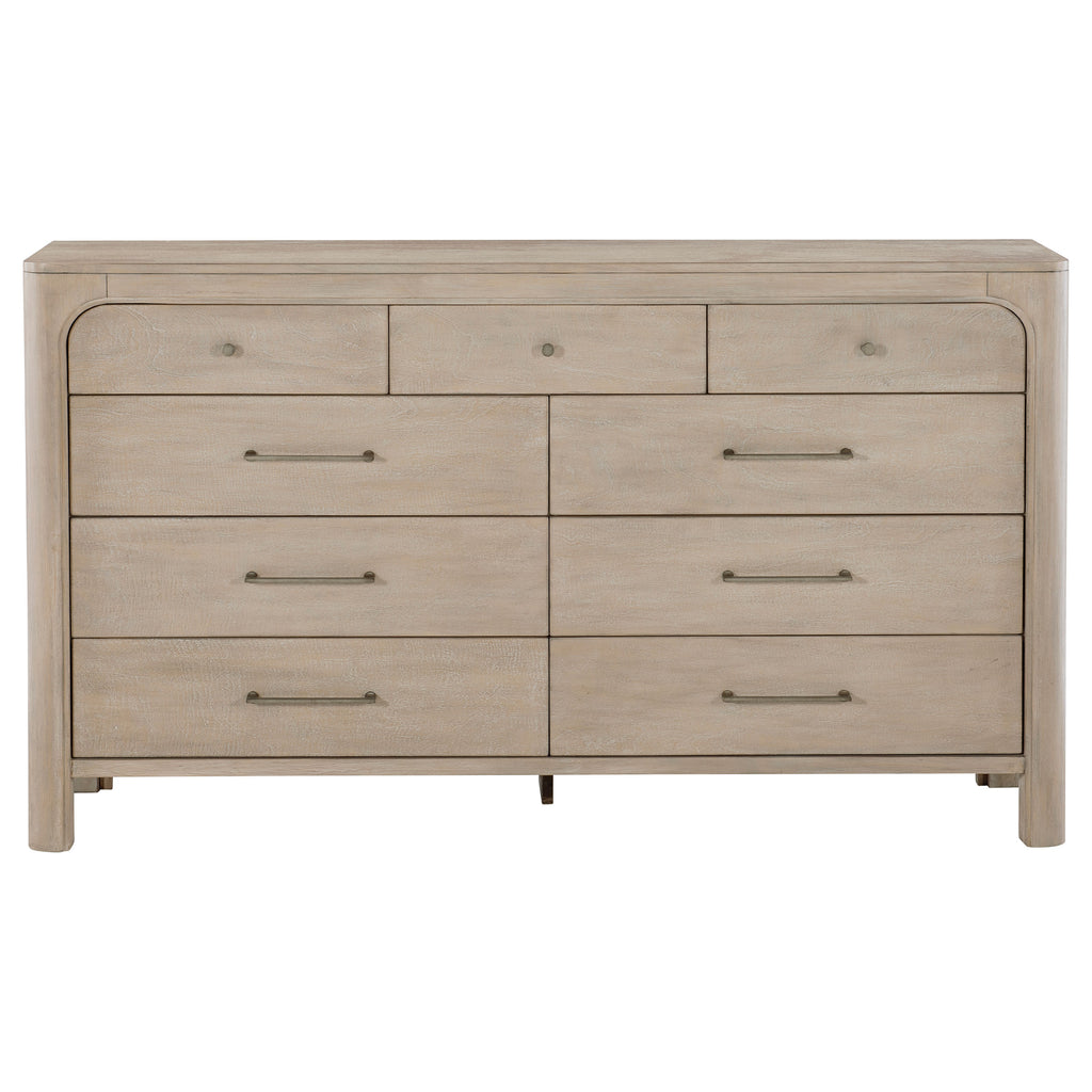 With softened curves and a sculpted profile, this nine-drawer dresser brings refined balance to the bedroom. Arched corners frame spacious drawers with gentle ease, while antique-finished hardware adds a whisper of vintage charm. A hidden jewelry tray and felt-lined top drawers elevate everyday use with thoughtful luxury. Crafted from mahogany, engineered wood, and mango veneer, it offers enduring grace and generous storage. Key Features: • Nine-drawer dresser with rounded edges and sculpted profile for graceful bedroom storage • Weathered mango finish brings natural warmth and subtle wood grain texture • Felt-lined top drawers offer soft storage for delicate pieces and daily essentials • Hidden jewelry tray in upper right drawer adds refined organization and security • Heavy duty drawer glides ensure smooth, quiet drawer function over time • Crafted from mahogany, engineered wood, and mango veneer for durable structure